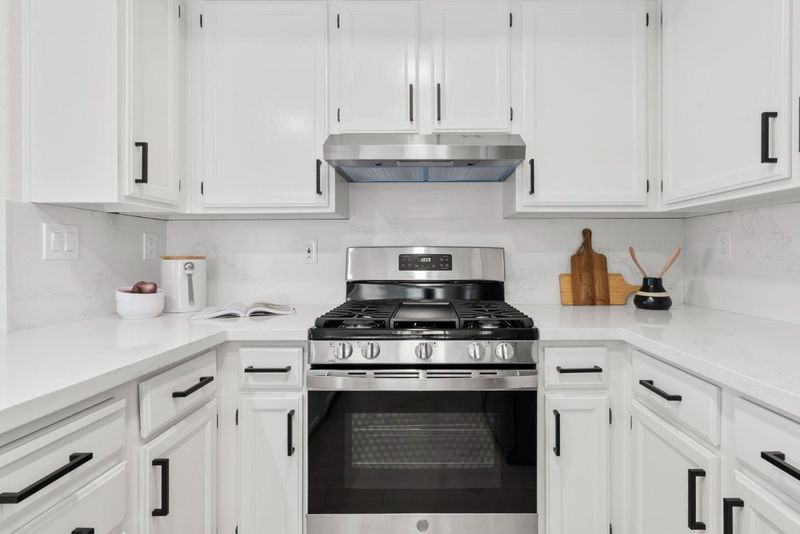 - Countertop - Quartz, Dishwasher, Garbage Disposal, Hood Over Range, Hookups - Gas, Oven Range - Gas, Refrigerator