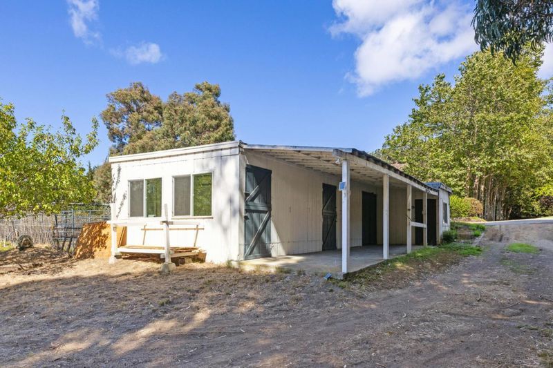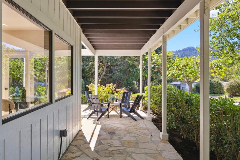 Nestled just two miles from Carmel, this property offers a serene escape on 1.8 acres of lush landscape. Surrounded by the soothing sounds of the Carmel River and whispers of the leaves this haven reveals a charming residence with expansive lawns and vistas. The single-story main home features a beautifully appointed three-bedroom, two-and-a-half-bath layout with light-filled spaces and an inviting eat-in kitchen. A stone fireplace, custom bookshelves, and refinished oak floors are enhanced by a skylight that illuminates marble counters and high-end appliances. With ample windows and doors leading outside, the living area extends to outdoor spaces, ideal for entertaining. The primary suite, a tranquil retreat, features a bay window overlooking a private fenced yard and deck. The spacious bath offers a spa-like experience with granite and stone finishes. A standalone one-bedroom, one bath guest house provides versatile space for guests or an office. Enjoy breathtaking southwest mountain views, framed by lawns and olive trees. The grounds include a two-stall barn with paddocks, a workshop, and a tack room. The property is supported by its own irrigation well and CalAm water service. This is more than a home; it's a place to celebrate life in Carmel Valley with friends and family.