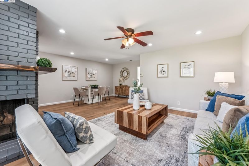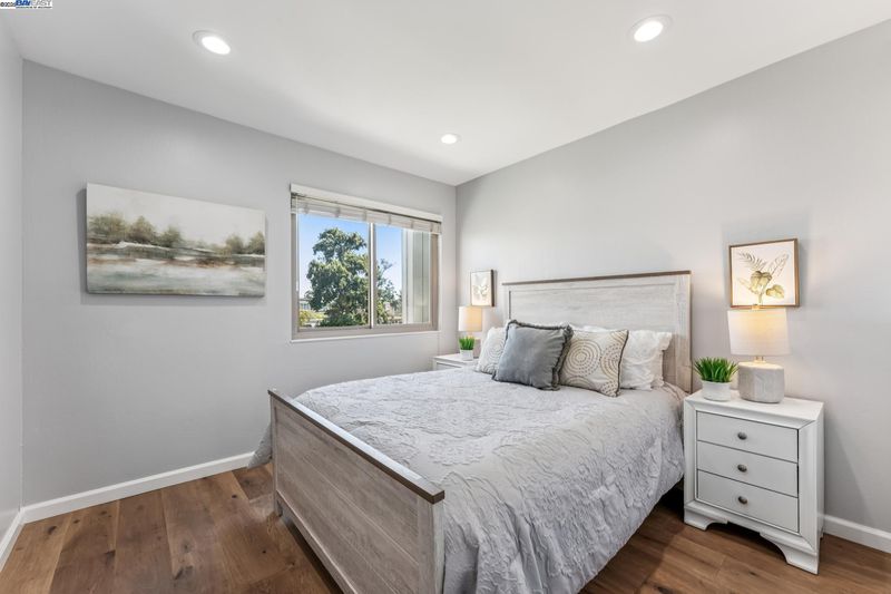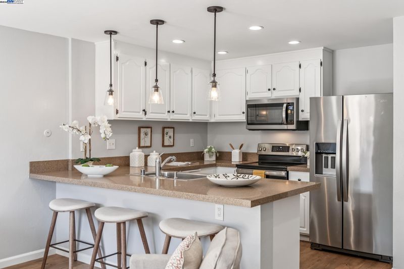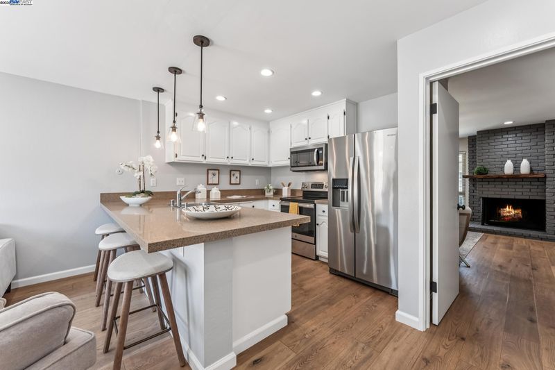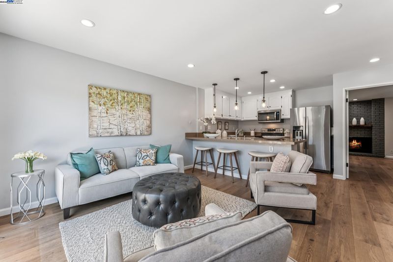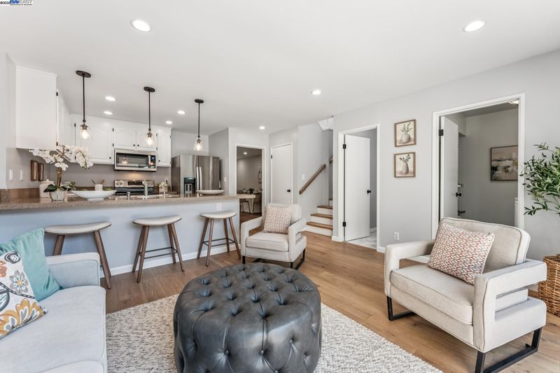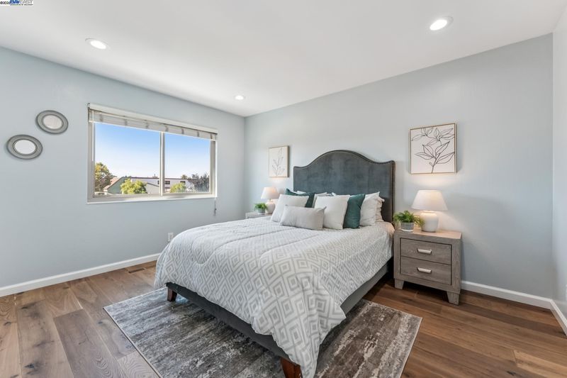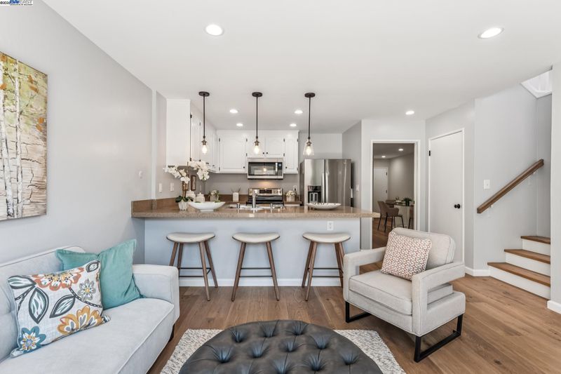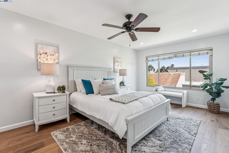 Beautifully updated 4BR/2.5BA townhome in Alameda’s Bay Farm community. This spacious home features engineered hardwood floors throughout, recessed lighting, dual-paned windows, and fresh interior paint. The open living and dining areas are anchored by a custom redwood fireplace mantel, while the eat-in kitchen offers pendant lighting, pantry, counter seating, and newer appliances. A private stamped-concrete patio extends the living space outdoors. Upstairs, the primary suite boasts a remodeled bath with custom tile, waterfall shower, dual-sink vanity, and farmhouse paneling. The guest bath was also fully updated with a soaking tub, new tile, vanity, and fixtures. A remodeled half bath and laundry room with washer/dryer are conveniently located downstairs. Additional highlights include a 2-car garage, new patio screen, and community pool/clubhouse just steps away. Situated across from a greenbelt and close to top-rated schools, parks, shoreline trails, shopping, and the SF ferry — this move-in ready home is a must-see!