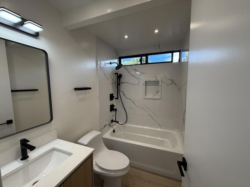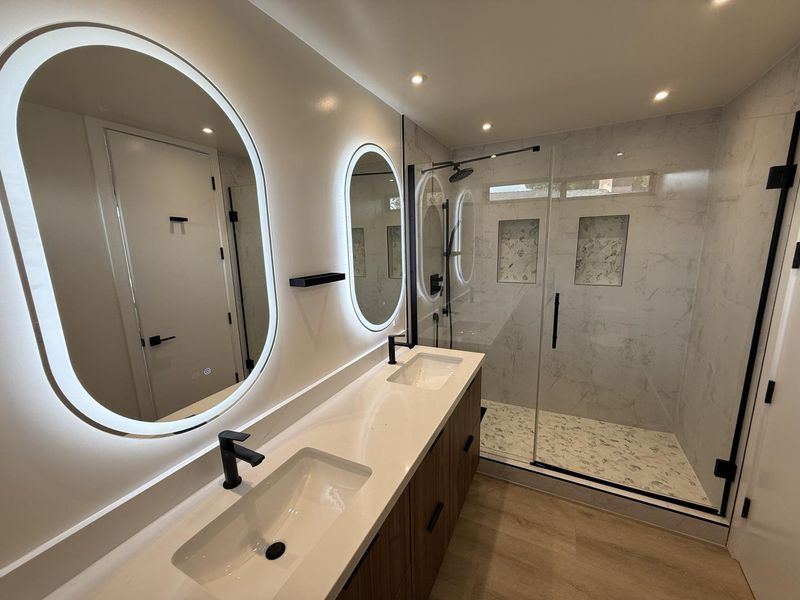 - Double Sinks, Shower and Tub, Shower over Tub - 1, Stall Shower, Tile, Updated Bath