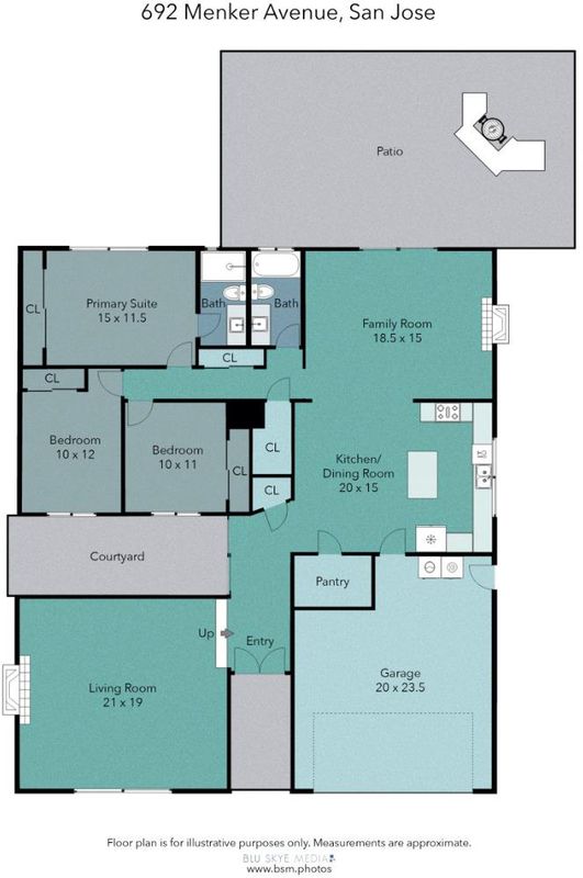 Spacious and beautifully updated home that features gleaming hardwood floors, tile appointments and high ceilings. Ideal for both elegant entertaining and relaxing with friends, the home begins with a bright, formal living room and then continues to an expansive great room, which includes a dining area, granite appointed kitchen with island and an inviting family room. Kitchen features gas range, abundant cabinets plus a large pantry. A secluded courtyard off the dining area is ideal for morning coffee. 3 bedrooms and 2 baths, including a primary suite. Private backyard with patio, barbecue area. numerous fruit trees. Solar (owned). newer roof plus air conditioning. Campbell school district (buyer to verify) Close to downtown Willow Glen or Pruneyard with easy access to commute routes.