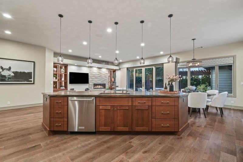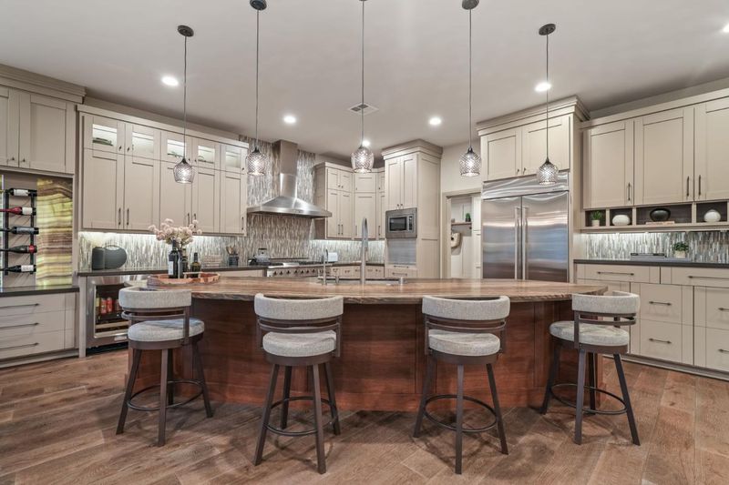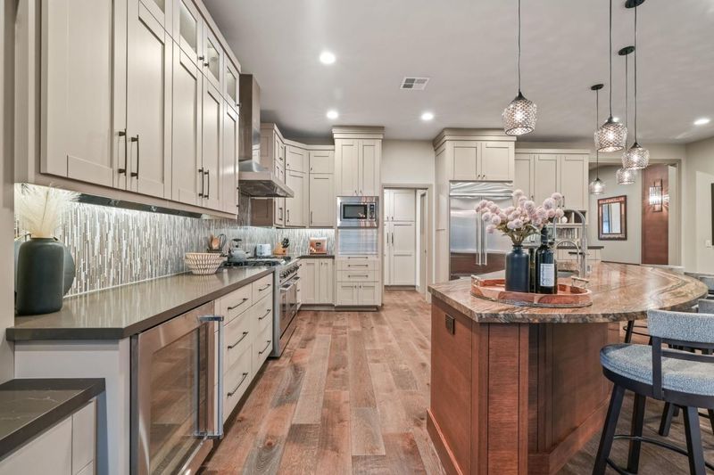 - Cooktop - Gas, Countertop - Granite, Dishwasher, Garbage Disposal, Hood Over Range, Island with Sink, Microwave, Oven Range - Built-In, Gas, Pantry, Refrigerator, Warming Drawer, Wine Refrigerator